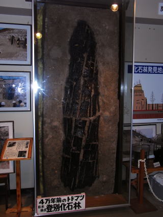 これは、4万年前のクッタラ火山の噴火により焼け焦げたトドマツ。道路工事の際に、立ったままの状態で発見されたもので、大変貴重なものらしいです。